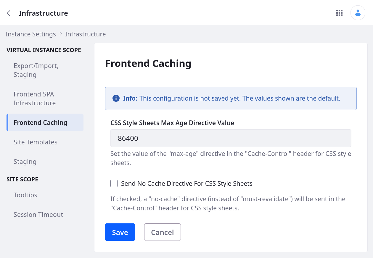 For those files that can not be hashed, because they are generated in runtime by the server depending on some parameter such as the css tokens, a new onfiguration is available in DXP to configure the TTL and the possibility to add the no-cache header, that ensures the revalidation of the asset with the server before to being served.