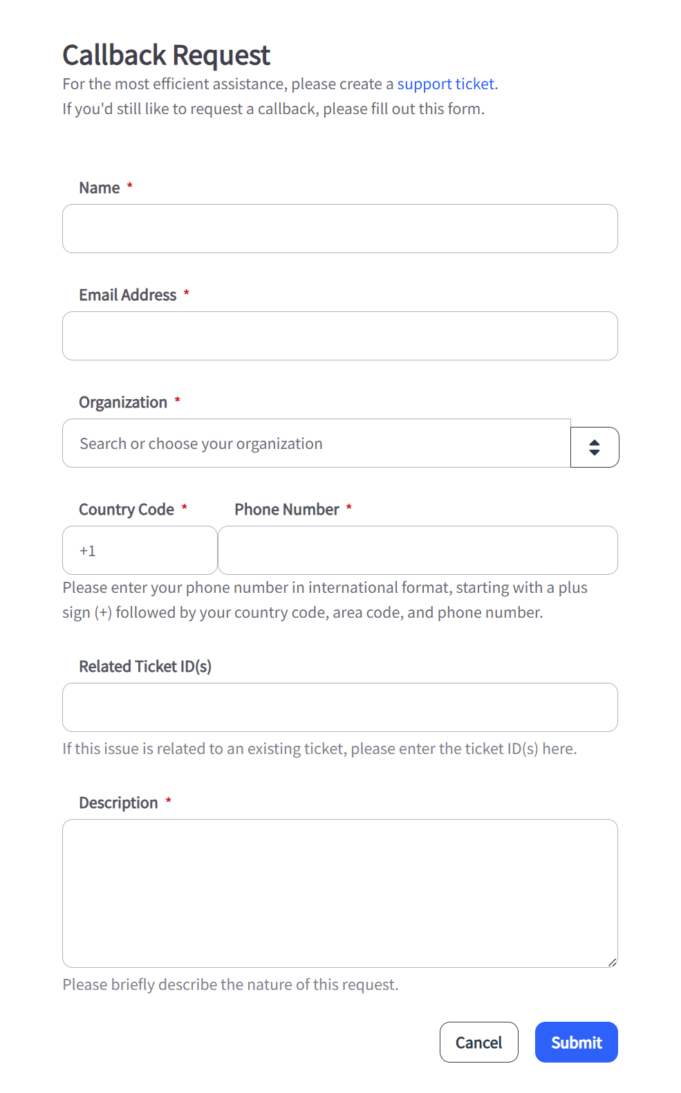Anyone listed as a member of your team can submit a callback request even if they cannot submit ticket requests. This includes partners, support administrators, support requesters, and support users. Even if a user does not have permissions to open a ticket, they can still request phone support through the form.